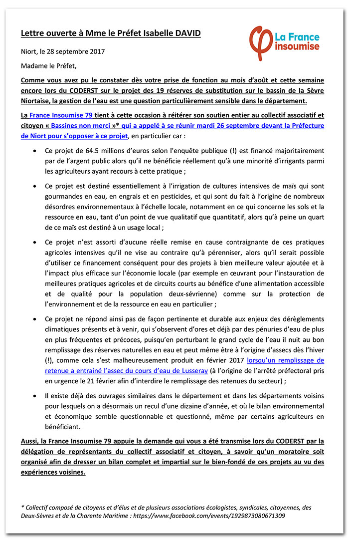 Déjà engagée contre ce projet lors de la campagne législative, la France Insoumise 79 a tenu à soutenir ce collectif et à contribuer au mouvement s’opposant à ce projet en adressant une lettre ouverte au Préfet des Deux-Sèvres, qui doit rendre prochainement sa décision sur ce dossier.